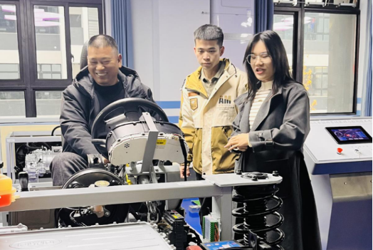 县人大代表和政协委员们心系家乡技工教育发展,着重视察了安化县技工学校的新能源汽车检测与维修专业的实训室。实训室内设备齐整,工具井然有序,政协委员们不时驻足,关怀询问学生技能掌握情况。更有人大代表亲身体验实车操作,感受产教融合的魅力。参观全程赞誉不断,委员、代表们对安化县技工学校校企合作、产教融合、工学一体化的教学模式给予高度肯定。