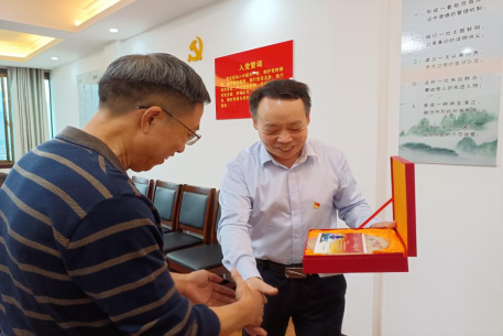 贺刚林为退休干部王培国颁发纪念牌,代表县纪委监委向其为纪检监察工作付出的心血、作出的贡献表示衷心感谢,并向退休干部们表达了节日的问候。