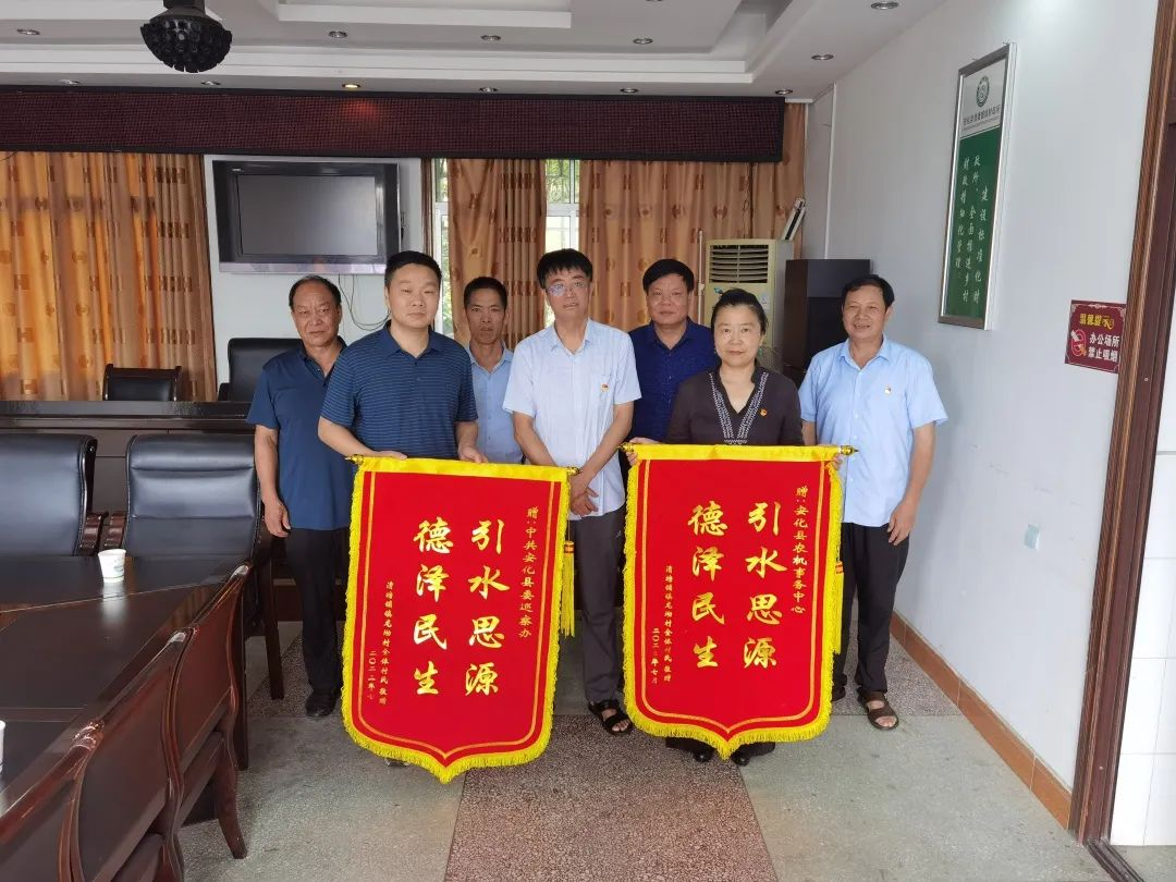 近日,安化县清塘铺镇龙坳村村支两委及村民代表来到清塘铺镇政府,将两面印有“引水思源 德泽民生”的锦旗送到县委第三巡察组及县农机事务中心相关负责人手中,对他们推动解决群众“急难愁盼”问题表达最诚挚的谢意。