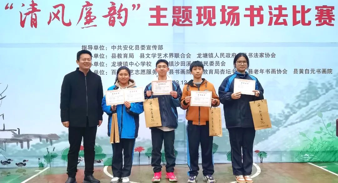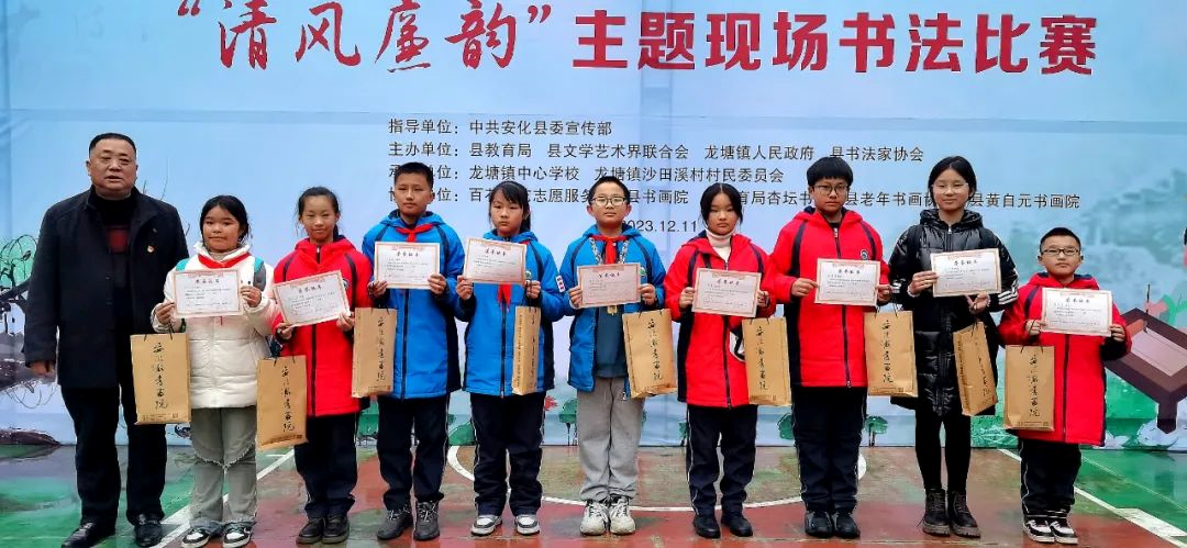 省委宣传部驻沙田溪村工作队队长吴良琴,县文联、县教育局、龙塘镇人民政府、县书法家协会、县书画院、黄自元书画院、县硬笔书法家协会相关负责人为获奖学生颁奖。县书法家协会主席就本次书法比赛作品进行专业点评。