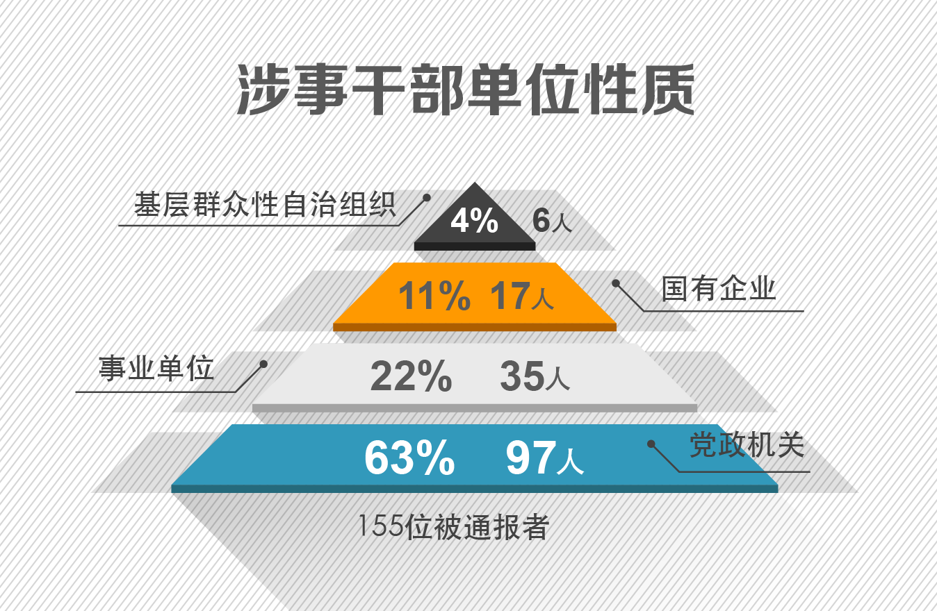 从分布领域看,155位被通报者,以党政机关干部最多,占六成以上;事业单位、国有企业位居其次;村委会、居委会干部相对较少。