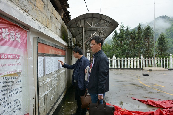 在对溪村,邓友良与村“两委”班子成员、驻村干部等人进行详谈,了解目前村级换届选举工作进度及存在的问题。查看了村级财务审计的公示情况,查阅换届选举相关资料,在访谈与查阅的过程中,对发现的问题一一罗列汇总,直面问题,切中要害,并提出整改意见与整改完成期限。
