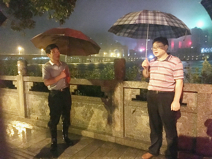 6月30日凌晨3点,柘溪水库出库流量7000m3/s后,安化县纪委常务副书记、监察局局长殷增业(右一)陪同县委书记熊哲文查看洪峰过后水位情况。