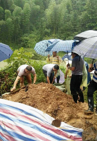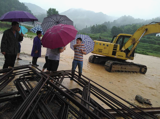 安化县冷市镇纪委书记王炼(右一)正在指导疏通马桥村马安高速下的堰塞湖。