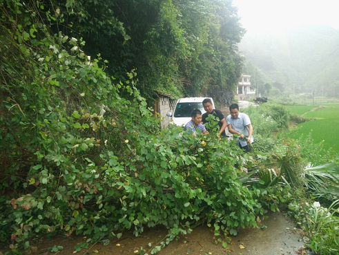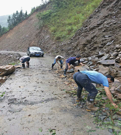 安化县南金乡纪委书记尹付明(右一)正在毗溪村公路上搬离障碍物。
