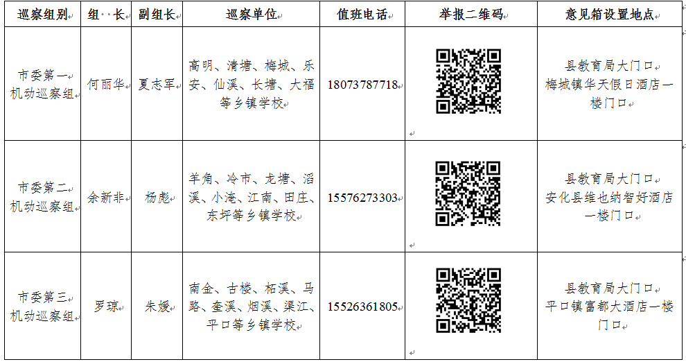 巡察期间专门设立值班电话和征求意见箱,并公布“码上巡察”微信举报二维码,主要受理上述单位巡察任务范围内的举报和反映(受理时间:6月3日至7月3日,工作日上午8:30-12:00,下午14:30-18:00)。其他不属于巡察受理范围的信访问题,按有关规定处理。巡察组在巡察期间的具体安排和联系方式如下(见附表)。