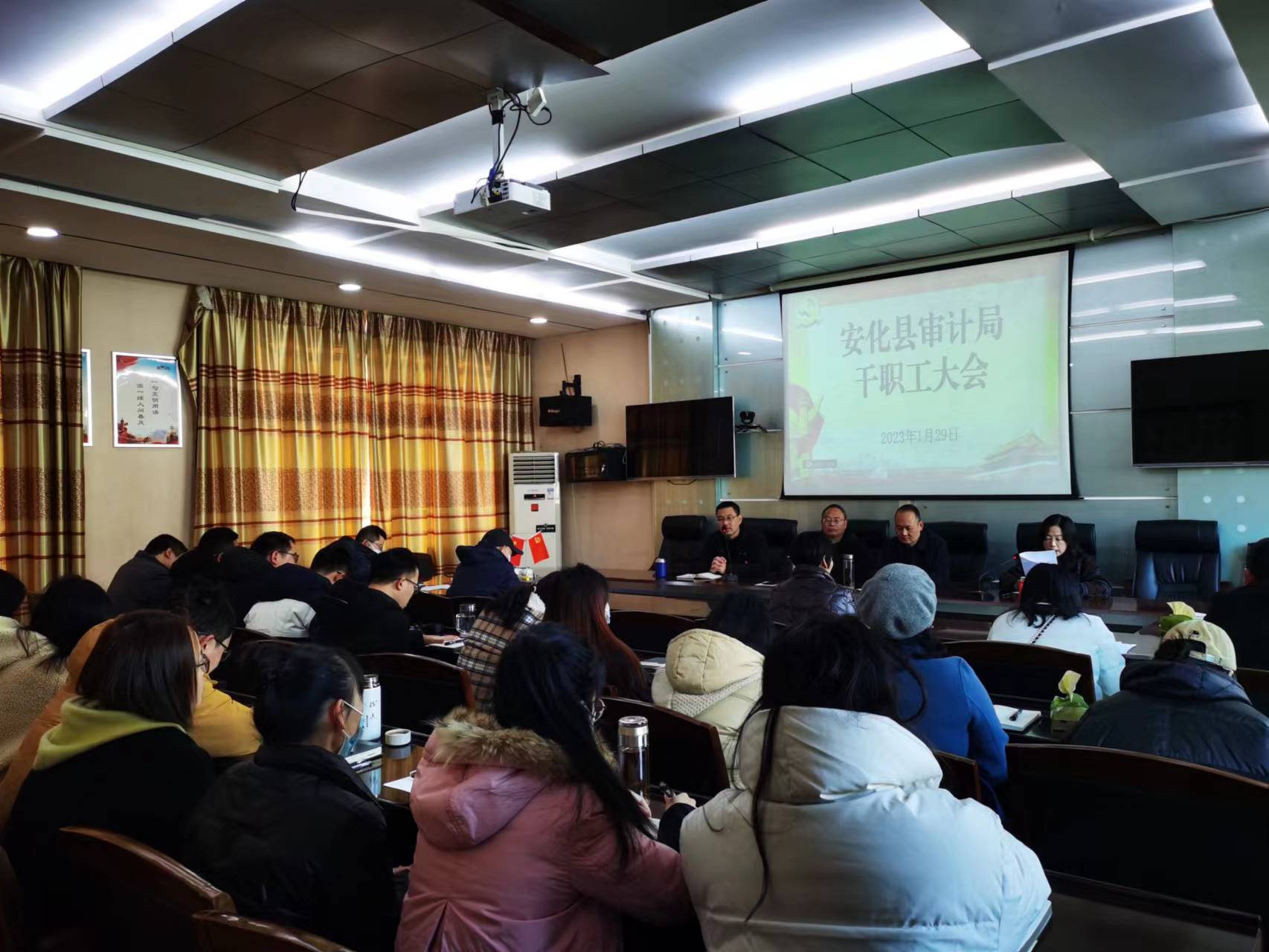 1月29日上午9:00,安化县审计局在局机关六楼会议室召开全体干职工会议。会议集中学习《安化县人民政府关于当前及今后一段时期落实过“紧日子”要求严格财政支出管理的通知》(安政发〔2023〕4号)、省纪委办公厅《关于锲而不舍落实中央八项规定精神深化纠治“四风”工作的若干措施》(湘纪办发〔2022〕7号)两个文件。总结2022年工作,部署2023年工作,提出“突出抓好党建引领、突出抓好审计质量、突出抓好审计整改、突出抓好中心工作、突出抓好队伍建设”五项任务,并对当前工作作了具体安排。要求全局同志进一步提高站位,振奋精神,主动作为,务求实效,以不负韶华、只争朝夕的精神,努力做好全年各项工作,为县域经济社会发展保驾护航。