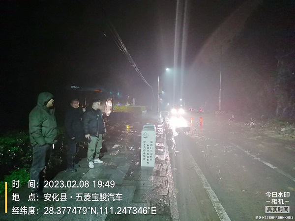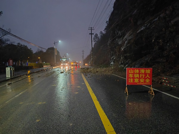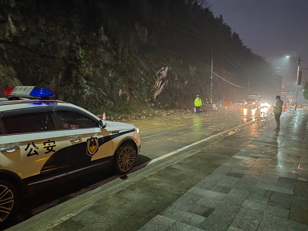 到达现场后,发现大量山石、泥土掩埋了公路路面,阻断了沿线道路通行,现场未发现人员伤亡情况。为防止意外事故发生,工作人员冒雨在滑坡路段设置警示牌、拉警戒带,并维护现场交通秩序,对塌方路段进行疏通,对滑坡山体进行排险加固。经过1个多小时的连续奋战,当日晚上9点,落石路段交通恢复畅通。