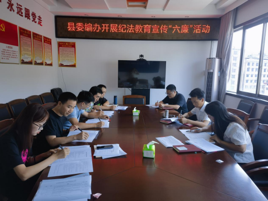 近日,根据县纪委监委关于开展纪法教育宣传“六廉”活动的要求,县委编办认真部署,积极开展纪法教育宣传活动,以党规党纪教育增强党员干部纪律自觉,提升党员干部的能力素质,推进廉洁文化建设走深走实。