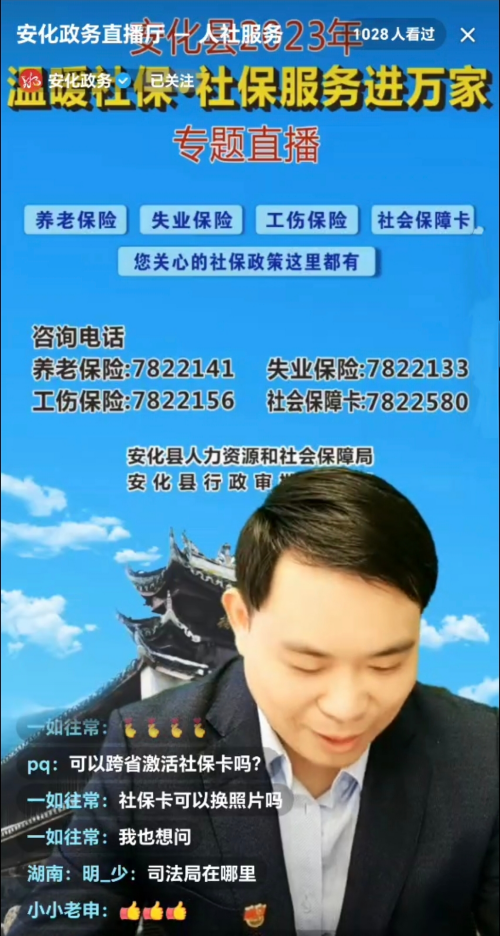 10月24日起,每天上午9点“主播”准时在屏幕前开播,分批次直播宣讲养老保险、社会保障卡、失业保险和工伤保险政策。目前直播已进行了3场,观看人数3000余人。安化社保惠民好声音的开播有效宣传了社保政策,进一步推动了“智慧”社保发展、扩大了“指尖”社保影响力,擦亮了“安化社保服务进万家”品牌,为全省“温暖社保”活动的推进贡献了安化力量。