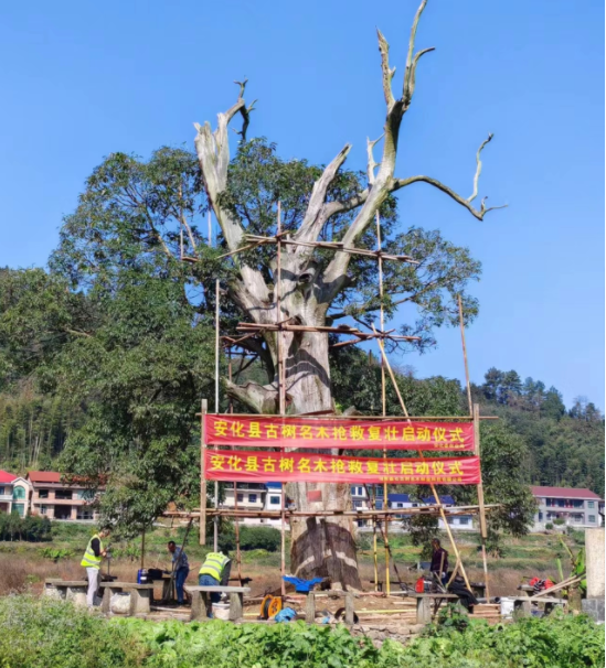 11月17日,安化县古树名木抢救复壮工作在仙溪镇启动,县林业局党组成员、副局长蒋再华带领一支有丰富经验的古树抢救复壮技术队伍进驻,按照“一树一策”的要求,对每棵古树存在的问题对症下药,制定精准的抢救复壮实施方案。救复工程队通过环境治理、树洞防腐修补、树体支撑加固、病虫害防治等抢救复壮措施,将陆续对县域内生长衰弱、濒危的十株一级古树进行修复,确保古树名木生境得到改善,使古树名木从“病恹恹”到“容光焕发”。