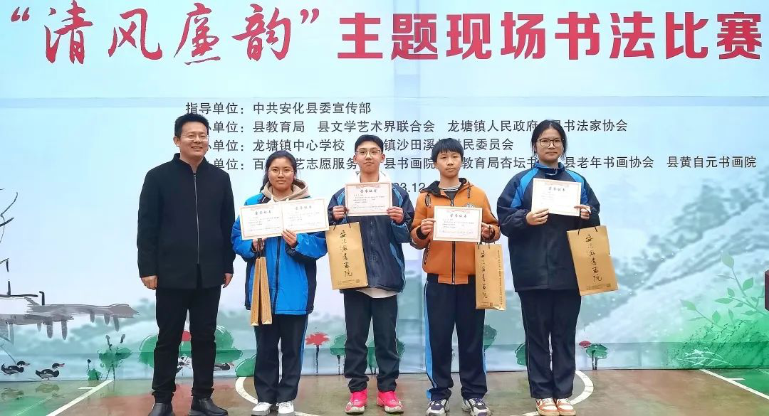 近日,“黄自元杯”全县中小学生现场书法比赛在龙塘镇沙田溪村黄自元书法学校举行。比赛由中共安化县委宣传部指导,县教育局、县文学艺术界联合会、龙塘镇人民政府、县书法家协会等部门联合主办。省委宣传部驻沙田溪村工作队队长吴良琴,县委宣传部副部长黄向华,县文学艺术界联合会主席李定新,县教育局党组成员、主任督学刘周明,龙塘镇党委副书记康彩霞,县书法家协会主席彭凡卿等出席活动。 比赛内容现场抽签确定,来自全县各中小学校的79名决赛选手紧紧围绕“清风廉韵”主题,蘸墨挥毫,笔走龙蛇,创作了一幅幅遒劲有力、锋芒毕露的书法作品。作品充分突出自元书法元素,书写内容健康向上。经比赛组委会现场评比,共评选出初中组一等奖5个、二等奖9个、三等奖17个,小学组一等奖9个、二等奖17个、三等奖22个。组委会分批次为获奖选手颁发荣誉证书和奖品。 省委宣传部驻沙田溪村工作队队长吴良琴为获奖选手颁奖 彭凡卿对本次现场书法比赛进行了总结和点评,对全县广大中小学生传承自元文化,弘扬书法艺术提出了殷切希望。 刘周明希望参赛选手以书法为媒,展教育之美,让廉洁文化从笔尖根植于心,让书法这门落笔无声、发于心诉于眼的艺术发出更加耀眼的光彩,为全县“书香校园”和“清廉学校”建设增添力量,推动全县精神文明建设向纵深发展。 初审初校:罗习锋 复审复校:刘杰华 终审终校:刘胜辉