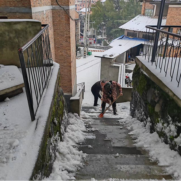 天空落下的冻雨和凛冽的寒风都抵挡不住志愿者们为群众服务的热情,纷纷投入到扫雪除冰行动中,只为让群众有一个便利的出行环境。党组副书记、副局长林敬田带领着身穿红马甲的志愿者们干得热火朝天,简易的铁锹、扫帚就是他们“战雪”的利器,大家不畏严寒,齐心协力,配合默契,行动迅速,铲、扫、推,忙得不亦乐乎。“红马甲”们共扫门前雪,让出行道路更加顺畅,让城市文明更加闪亮,共同维护干净整洁、安全有序的城市环境!通过扫雪除冰行动,把降雪带来的不利因素降到最低限度,争取少一人摔倒、少一起交通事故,用林业人的辛苦付出,换来了市民的出行便利与安全。