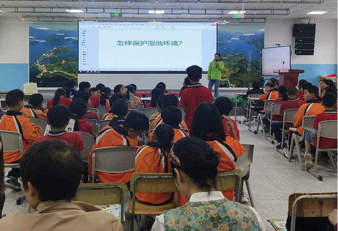 活动中,工作人员利用多媒体以图片、视频形式向两个班级共60余名同学们展示我们安化广袤的山林、水域中与我们人类共同生存着的野生动植物,以及近年来“走进”我们视线的野生动物和其面临的危险,并从认识湿地、保护湿地等方面讲述了一堂有趣的课程。学生们在在现场根据宣讲内容提出的问题,积极参与答题互动,答对者获得环保纪念品。“参加今天的活动,我收获满满,我深刻地了解到保护湿地、保护环境是我们每一个人的责任,需要从日常生活的一点一滴做起。”一名五年级的学生代表说道。