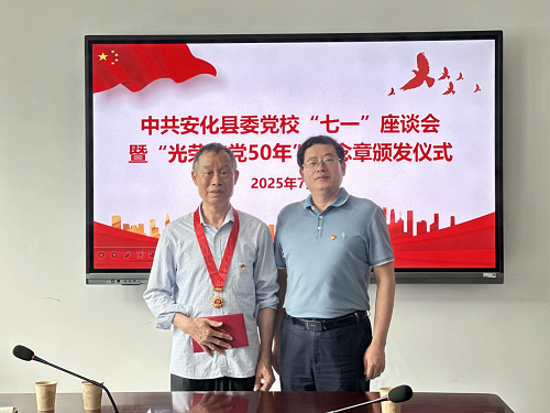 初心如磐,薪火相传。为热烈庆祝中国共产党成立104周年,7月1日,县委党校举行“七一”座谈会暨“光荣在党50年”纪念章颁发仪式。在重温入党誓词后,县委党校常务副校长、机关支部书记方建国为退休党员肖义芳同志隆重颁发“光荣在党50年”纪念章,向他多年来对党忠诚、为党尽职表示衷心感谢,并致以热烈的祝贺和崇高的敬意。