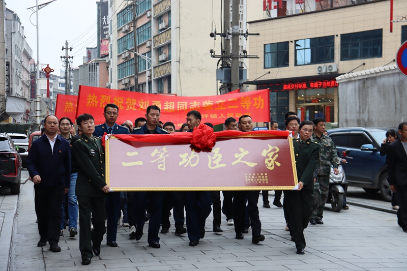 4月3日上午,东坪镇人民政府敲锣打鼓隆重为荣立二等功的现役军人刘勇超及其家属送去立功喜报、“二等功臣之家”牌匾及慰问金。