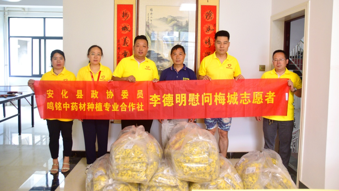 6月13日,安化县政协委员、安化鸣铭中药材种植专业合作社理事长李德明风尘仆仆来到梅城志愿者协会,向协会所有志愿者表示慰问,并向协会捐赠价值12000元的金丝皇菊共150份。