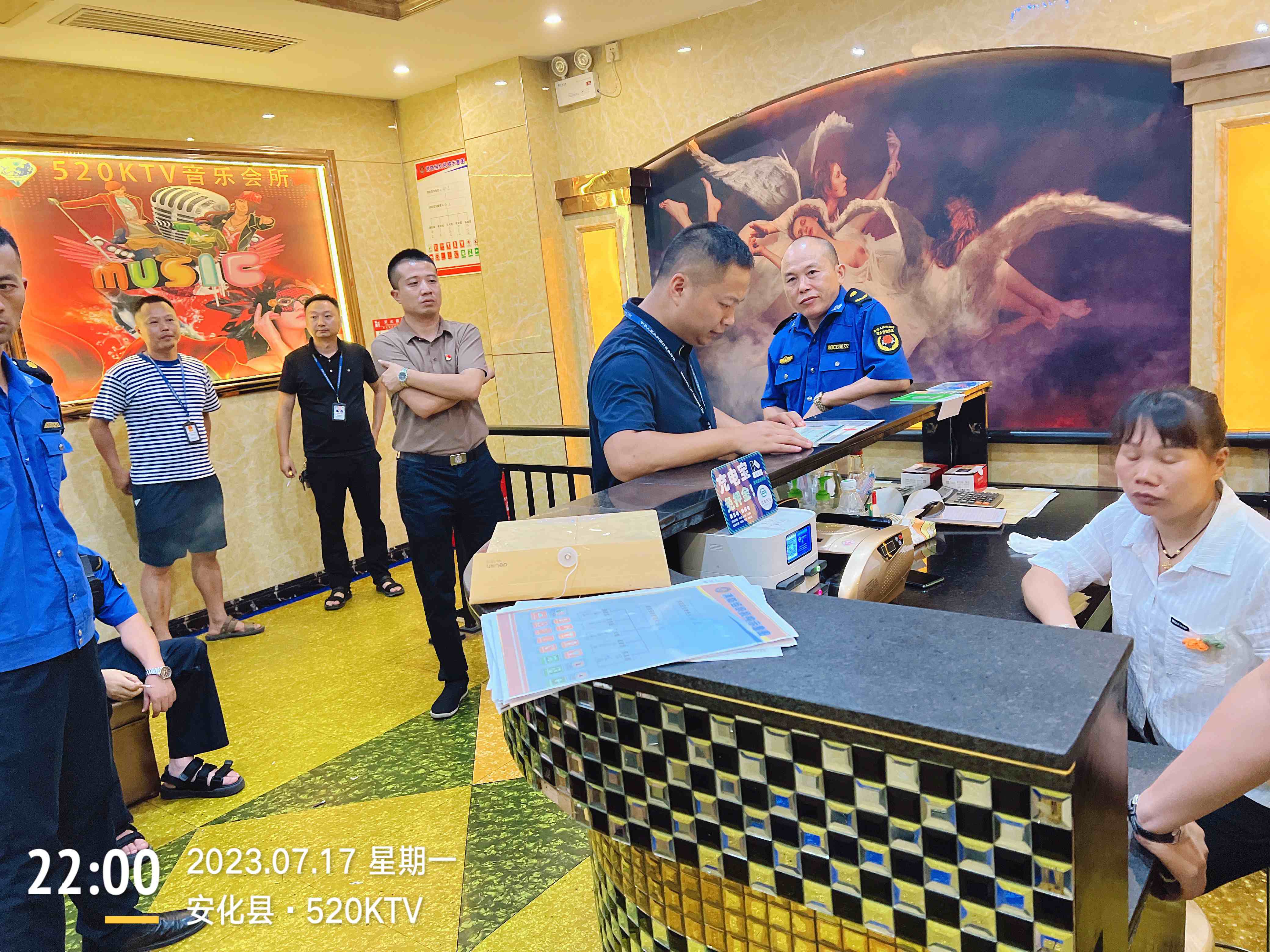 为持续深化夏季治安打击整治工作,进一步加大娱乐场所排查宣传力度,督促娱乐场所负责人落实禁毒义务,提高娱乐场所从业人员禁毒意识和防毒能力,7月17日晚,清塘铺镇镇长刘恺熙带队禁毒办联合派出所、应急办、社会事务综合服务中心、市监所等部门开展娱乐场所防范毒品工作落实情况专项夜查行动。 夜查行动中,社区禁毒工作人员对辖区内KTV、酒吧、棋牌室、旅馆酒店等重点娱乐场所,进行逐一检查,重点查看场所内醒目位置是否悬挂张贴禁毒宣传标识、是否开展禁毒宣传教育、是否落实人员登记等工作落实情况,对发现未张贴禁毒宣传标识等问题的娱乐场所要求其现场整改。