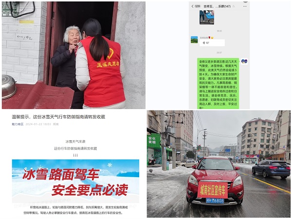 宣传预警,守护安全。通过宣传车流动宣传、网格微信群、村村响、微信公众号发布信息等方式,第一时间将预警信息和应对措施通知到各村(社区),提醒广大人民群众主动避灾、科学防灾、减少损失。开展敲门行动,发动村(社区)两委人员、“三长”上门入户,及时掌握特殊群体的衣食住行等情况,对因低温冰冻天气造成生活困难的快速研判、高度关注、精准救助,同时宣传用火用电安全、道路交通安全等防灾避灾知识,引导群众密切关注天气变化情况,积极做好防范措施,切实增强群众的风险防范意识。
