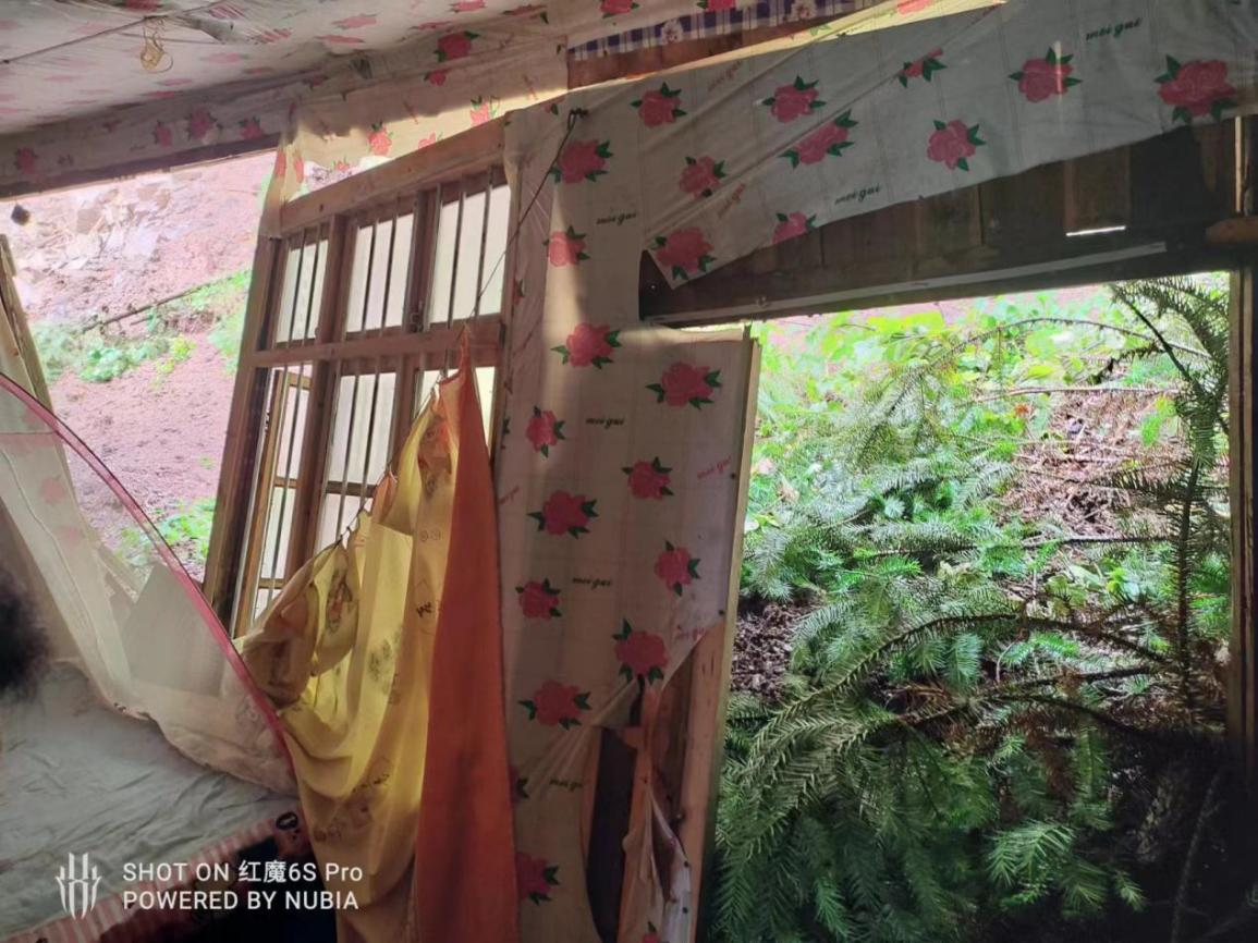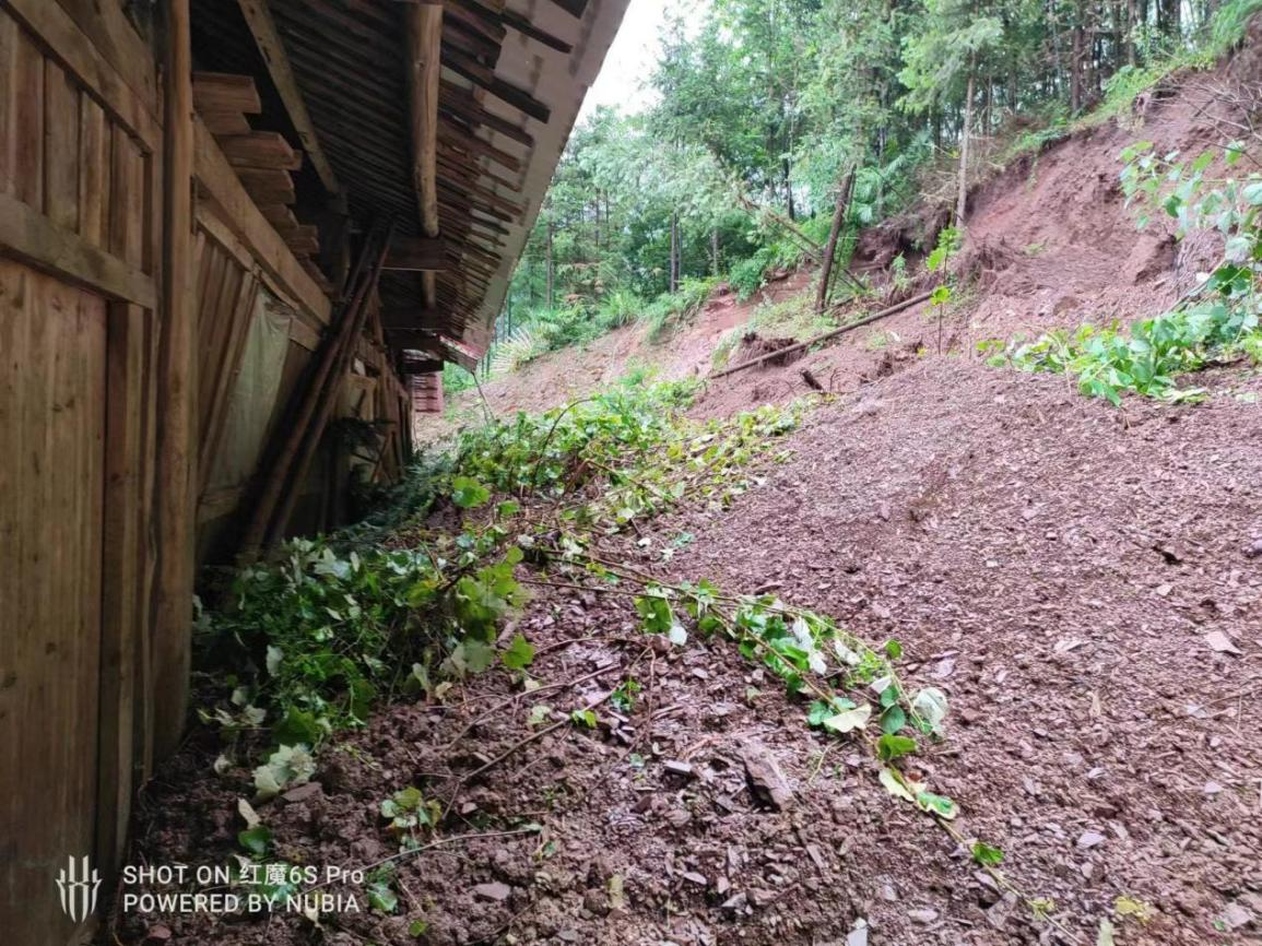 (6月22日清晨,王绪兴家的两间房因山体滑坡已经遭受了严重破损。) 面对如此严峻的形势,两位老人却不愿撤离。他们认为多年来并未发生过严重滑坡,再加上家中还有儿子的三间房间可以居住,因此认为没有必要撤离。救援小组深知滑坡灾害的不可预测性,不断劝说老人转移,最终于当天17时许成功组织王绪兴一家9口人安全转移至其亲属家中,并将情况上报东坪镇防汛抗旱指挥部。 23日一早,镇自然资源办工作人员到现场查看灾情。发现王绪兴房屋受到约500m3山体滑坡冲击,已有四间房发生垮塌,判定房屋已经无法居住,必须进行新址重建。因22日转移及时,王绪兴家无一人受伤。得知房屋已面目全非,王绪兴夫妇不禁感叹:“幸好及时转移了,不然真不知道会发生什么事。”他们对救援小组表示了衷心的感谢,并承诺将积极配合相关部门进行新址重建工作。