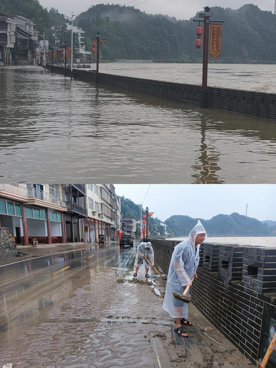 7月2日10时,柘溪水库出库量达6000m3/s,唐市社区资江沿线低洼路段被淹没。随着出库量下调,洪水逐渐褪去,受浸区域留下了大量淤泥、杂物和垃圾。县人大代表、唐市社区党支部书记张完桃带领选区人大代表、党员、村委成员一道开展清淤工作。 镜头二:齐心除障,全力保畅