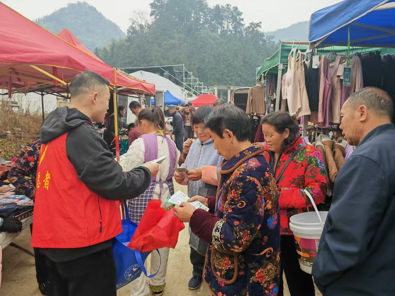 上午8时,趁着如火如荼的赶集开始,工作人员在集市入口中央悬挂横幅,确保每一位前来赶集的群众,能进入的第一眼就知道宪法日的到来。活动中,工作人员分成两组,有序地穿梭在人群中,向过往群众、集市摊主发放有关宪法、禁毒、未成年人保护法、反邪教、国家安全、防范诈骗等宣传手册,并结合农村工作实际,向群众讲解反电信网络诈骗、未成年人保护、禁毒等相关知识。活动现场,人头攒动,吆喝声此起彼伏,工作人员也拉高嗓门,热情地向群众讲解宣传资料的知识,以案释法的形式说明法律的重要性,引导群众可以将日常矛盾、困难利用法律的手段来解决。同时,其他工作人员将自制的法治贴纸粘贴到来自四面八方的摊铺车辆上。“帮我的车也贴几张,我要左边一张右边一张。”“我晓得禁毒,我都不准我屋里的人挨毒品的。”良好的氛围,让更多群众积极参与宣传、学习活动中,让法治意识和法治理念根植于心。