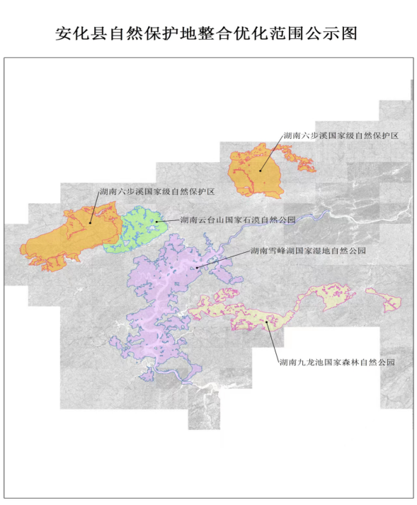 根据中办国办《关于建立以国家公园为主体的自然保护地体系的指导意见》《关于国土空间规划中统筹划定落实三条控制线的指导意见》文件精神,我县积极开展自然保护地整合优化工作,形成了《安化县自然保护地整合优化方案》,对县域内自然保护地进行了全面优化整合。现将相关情况公示如下: 一、基本情况 安化县原有湖南六步溪国家级自然保护区、安化红岩省级自然保护区、湖南雪峰湖国家湿地公园、湖南柘溪国家森林公园、湖南安化雪峰湖国家地质公园和湖南安化云台山国家石漠公园(试点)“两区四园”6个自然保护地,经整合优化为湖南六步溪国家级自然保护区、湖南云台山国家石漠自然公园、湖南九龙池国家森林自然公园和湖南雪峰湖国家湿地自然公园“一区三园”4个自然保护地,整合优化前自然保护地总面积63025.41公顷,整合优化后总面积为71000.12公顷。(详见附件) 二、具体整合优化情况和范围 (一)湖南六步溪国家级自然保护区(国家级):整合优化前,为原湖南六步溪国家级自然保护区(国家级)与安化红岩省级自然保护区(省级),面积分别为14239.00公顷、8960.00公顷。 整合优化后,为湖南六步溪国家级自然保护区(国家级),面积24956.57公顷。 (二)湖南云台山国家石漠自然公园(国家级):整合优化前,为原湖南安化云台山国家石漠公园(试点)(国家级)和湖南安化雪峰湖国家地质公园(国家级),面积分别为3731.10公顷、17580.00公顷。整合优化后,为湖南云台山国家石漠自然公园(国家级),面积6310.70公顷。 (三)湖南九龙池国家森林自然公园(国家级):整合优化前,为原湖南柘溪国家森林公园,面积8579.30公顷。整合优化后,为湖南九龙池国家森林自然公园(国家级),面积11000.99公顷。 (四)湖南雪峰湖国家湿地自然公园(国家级):整合优化前,为原湖南雪峰湖国家湿地公园(国家级),面积9936.01公顷。整合优化后,为湖南雪峰湖国家湿地自然公园(国家级),面积为28731.86公顷。 以上公示内容,如有异议,请在公示期内向安化县林业局反映。 公示时间:2023年3月28日至2023年3月31日 联系电话:0737-7291605 附件:安化县自然保护地整合优化范围公示图 安化县人民政府 2023年3月28日 附件