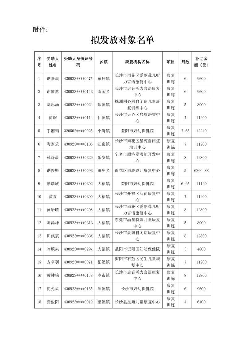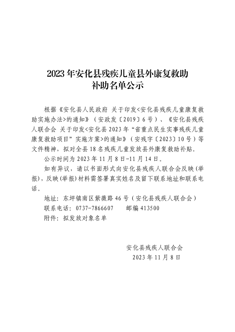 2023年安化县残疾儿童县外康复救助补助名单公示