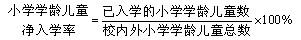 小学学龄儿童净入学率 指调查范围内已入小学学习的学龄儿童占校内外学龄儿童总数的比重。计算公式为: