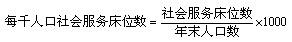 每千人口社会服务床位数 指老年及残疾人床位数、智障和精神疾病床位数、儿童床位数、救助及其他社会服务床位数的总和除以当年期末人口数乘以1000。计算公式为: