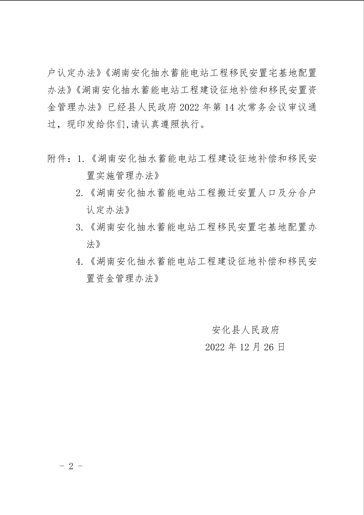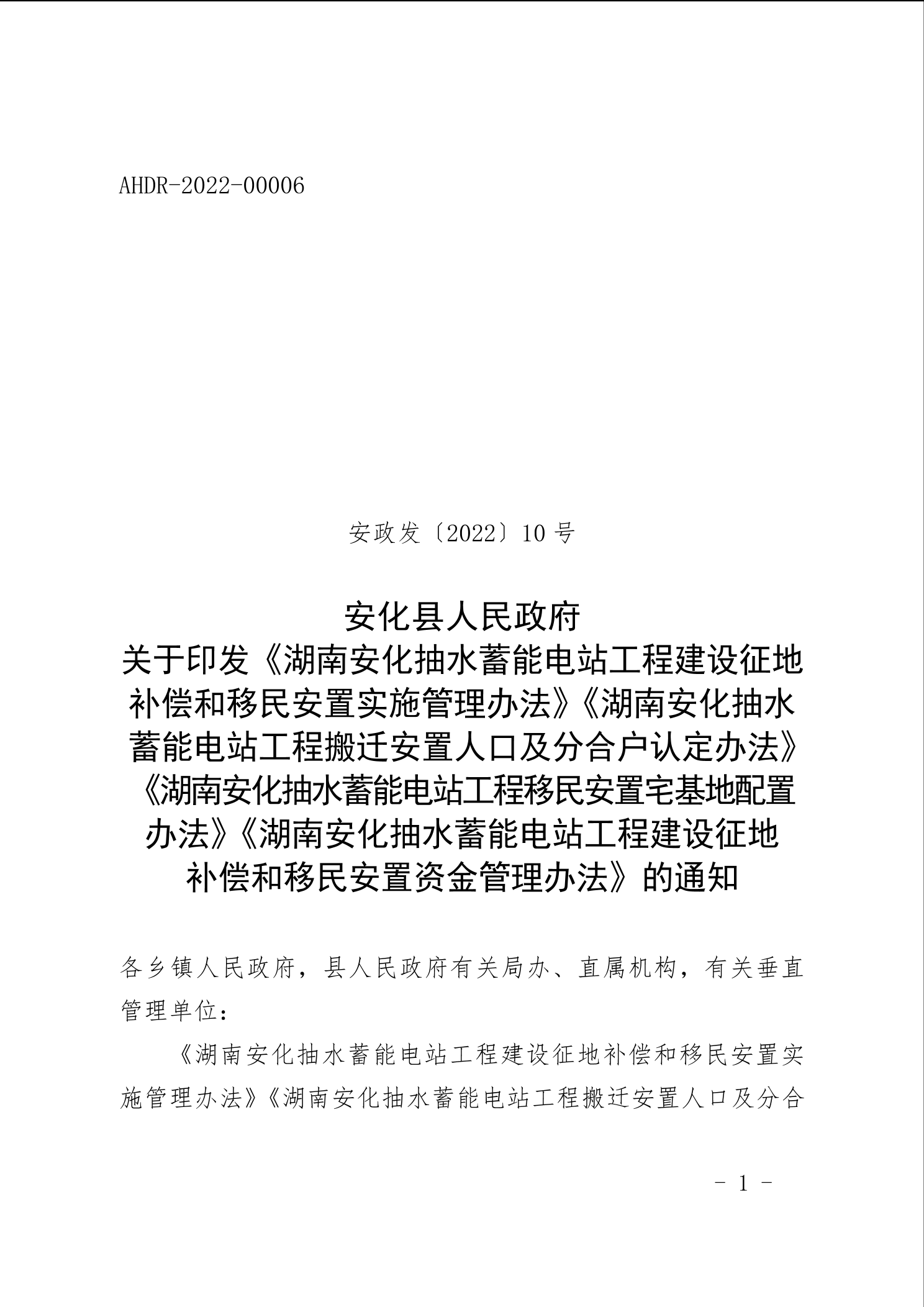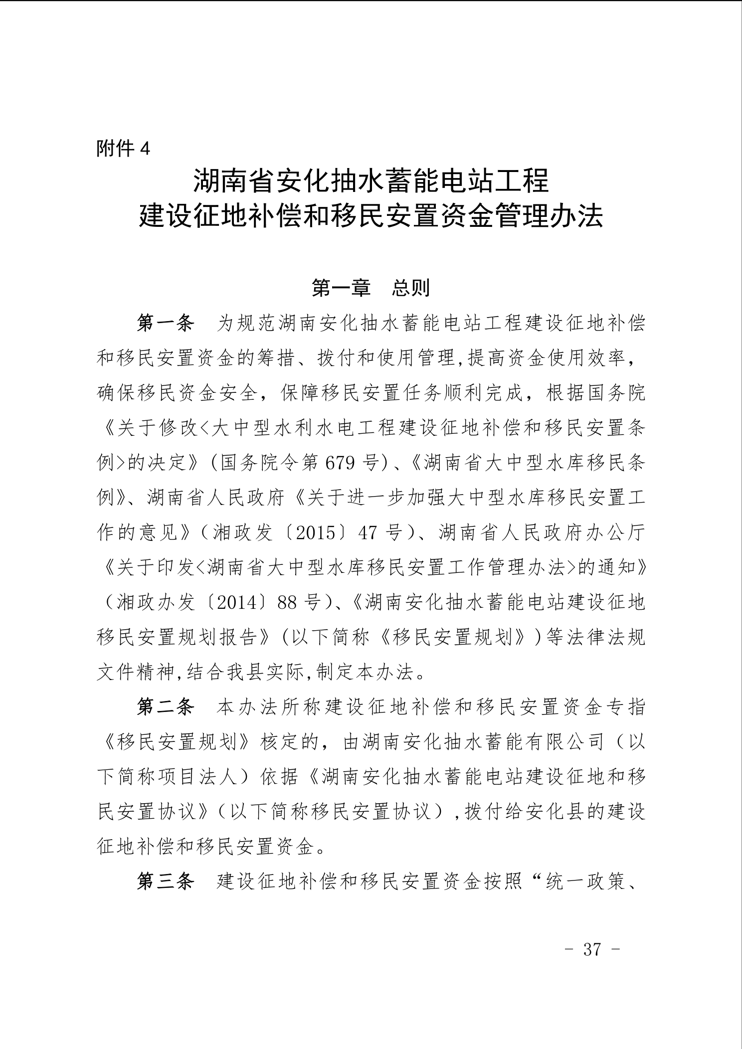 关于印发《湖南安化抽水蓄能电站工程建设征地补偿和移民安置实施管理办法》《湖南安化抽水蓄能电站工程搬迁安置人口及分合户认定办法》《湖南安化抽水蓄能电站工程移民安置宅基地配置办法》《湖南安化抽水蓄能电站工程建设征地 补偿和移民安置资金管理办法》的通知