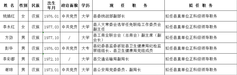 为了加强对干部选拔任用工作的监督,提高识别和任用干部的准确程度,现对县委常委会议研究决定的拟任职人选进行任前公示。欢迎广大干部群众反映拟任职人选思想作风、道德品质、工作能力、廉政勤政等方面存在的问题。反映问题可以通过信函、电话或到受理单位当面反映等形式进行。凡反映问题者,必须签署或告知本人真实姓名、工作单位或住址;对匿名信,公示期间一般不予受理。所反映的问题,必须真实、准确,内容尽量具体详细,并尽可能提供有关调查核实线索,严禁借机造谣中伤、串联诬告。反映问题者将受到保护。举报受理期限:2022年11月25日至2022年12月1日。联系电话:0737-7224131 0737-12380转2