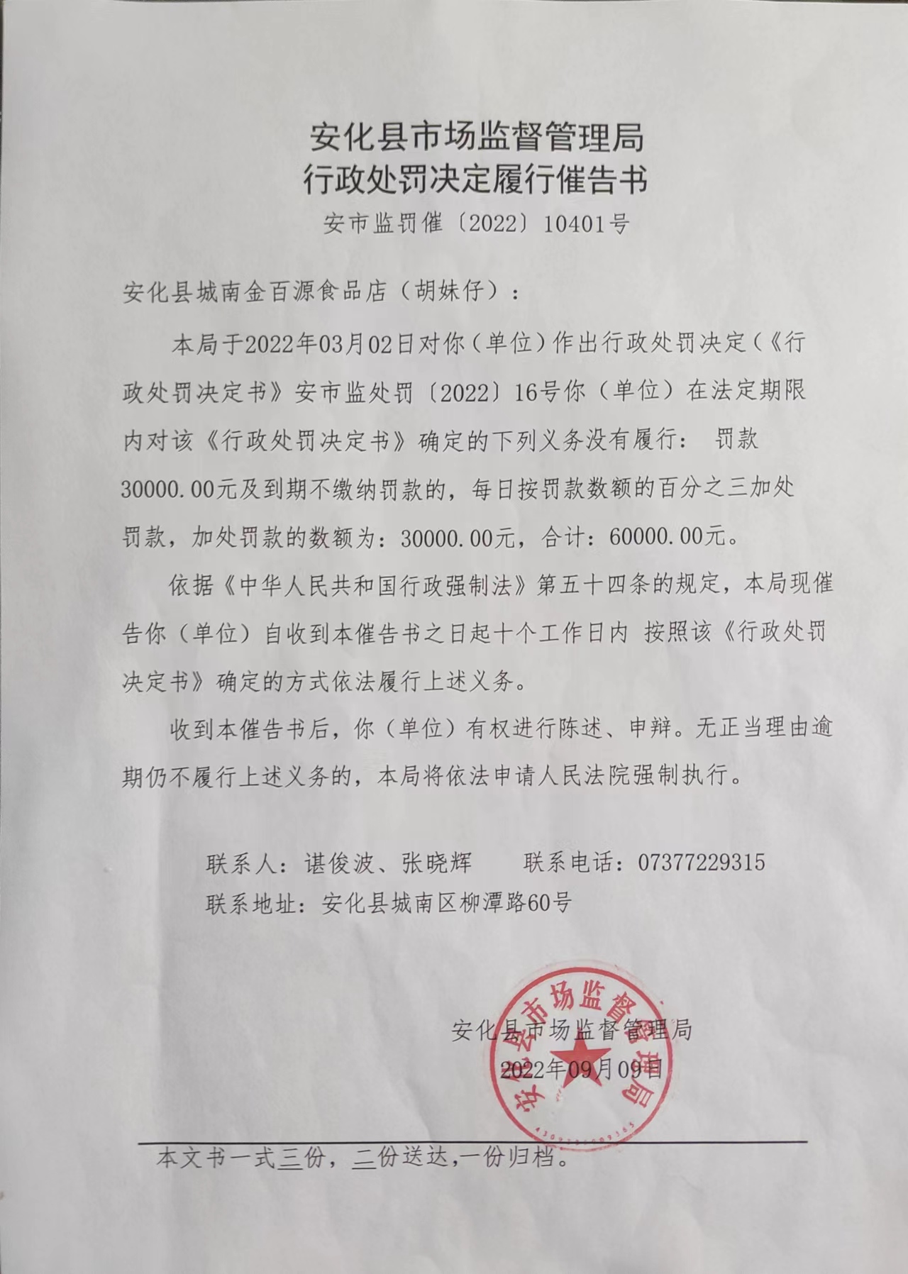 安化县市场监督管理局 行政处罚决定履行催告书送达公告 安市监罚催〔2022〕10401号 当事人:安化县城南金百源食品店 主体资格证照名称:营业执照 统一社会信用代码:92430923MA4RMJ537N 住所(住址):安化县城南区城南社区紫薇路24号 法定代表人(负责人、经营者):胡妹仔 身份证件号码:********* 因你(单位)未取得食品经营许可从事餐饮服务经营,本局于2022年03月02日对你(单位)作出行政处罚决定(《行政处罚决定书》安市监处罚〔2022〕16号)你(单位)在法定期限内对该《行政处罚决定书》确定的下列义务没有履行: 罚款30000.00元及到期不缴纳罚款的,每日按罚款数额的百分之三加处罚款,加处罚款的数额为:30000.00元,合计:60000.00元。 依据《中华人民共和国行政强制法》第五十四条的规定,本局现催告你(单位)自收到本催告书之日起十个工作日内 按照该《行政处罚决定书》确定的方式依法履行上述义务。 收到本催告书后,你(单位)有权进行陈述、申辩。无正当理由逾期仍不履行上述义务的,本局将依法申请人民法院强制执行。 因多次与你(单位)联系未果,现依法向你(单位)公告送达《行政处罚决定履行催告书》安市监罚催〔2022〕10401号。限你店自公告之日起60日内到本局领取《行政处罚决定履行催告书》,逾期则视为送达。 领取《行政处罚决定履行催告书》,请与本局联系(电话07377229315)。 特此公告。 安化县市场监督管理局 2022年09月09日