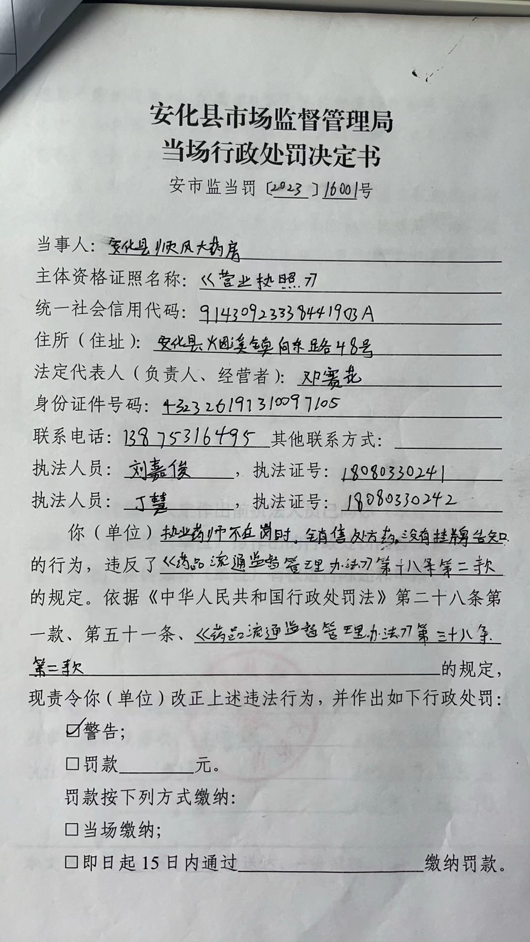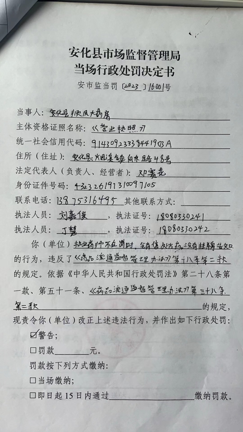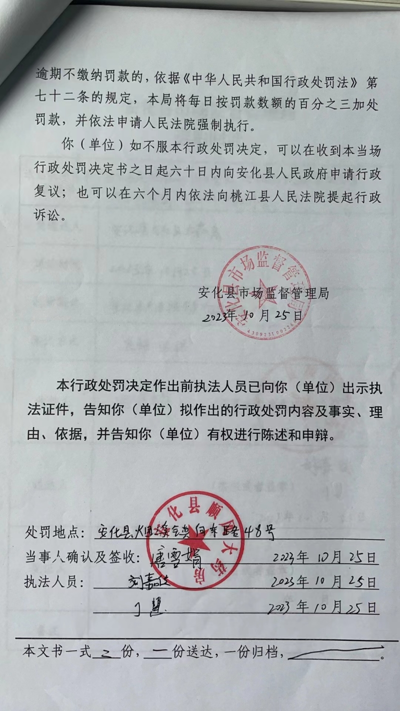 安化县市场监督管理局当场行政处罚决定书〔2023〕16001号