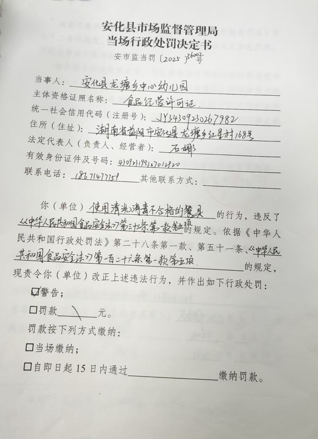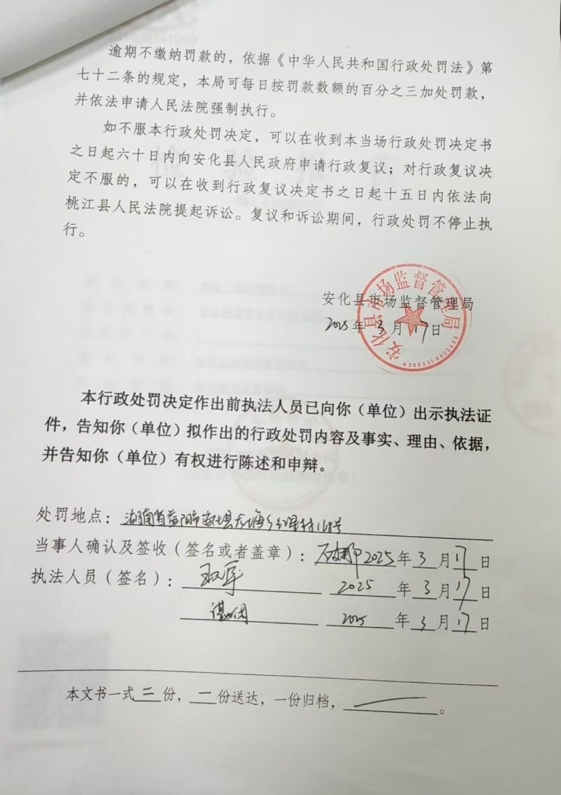 安化县市场监督管理局 当场行政处罚决定书 安市监当罚【2025】36002号