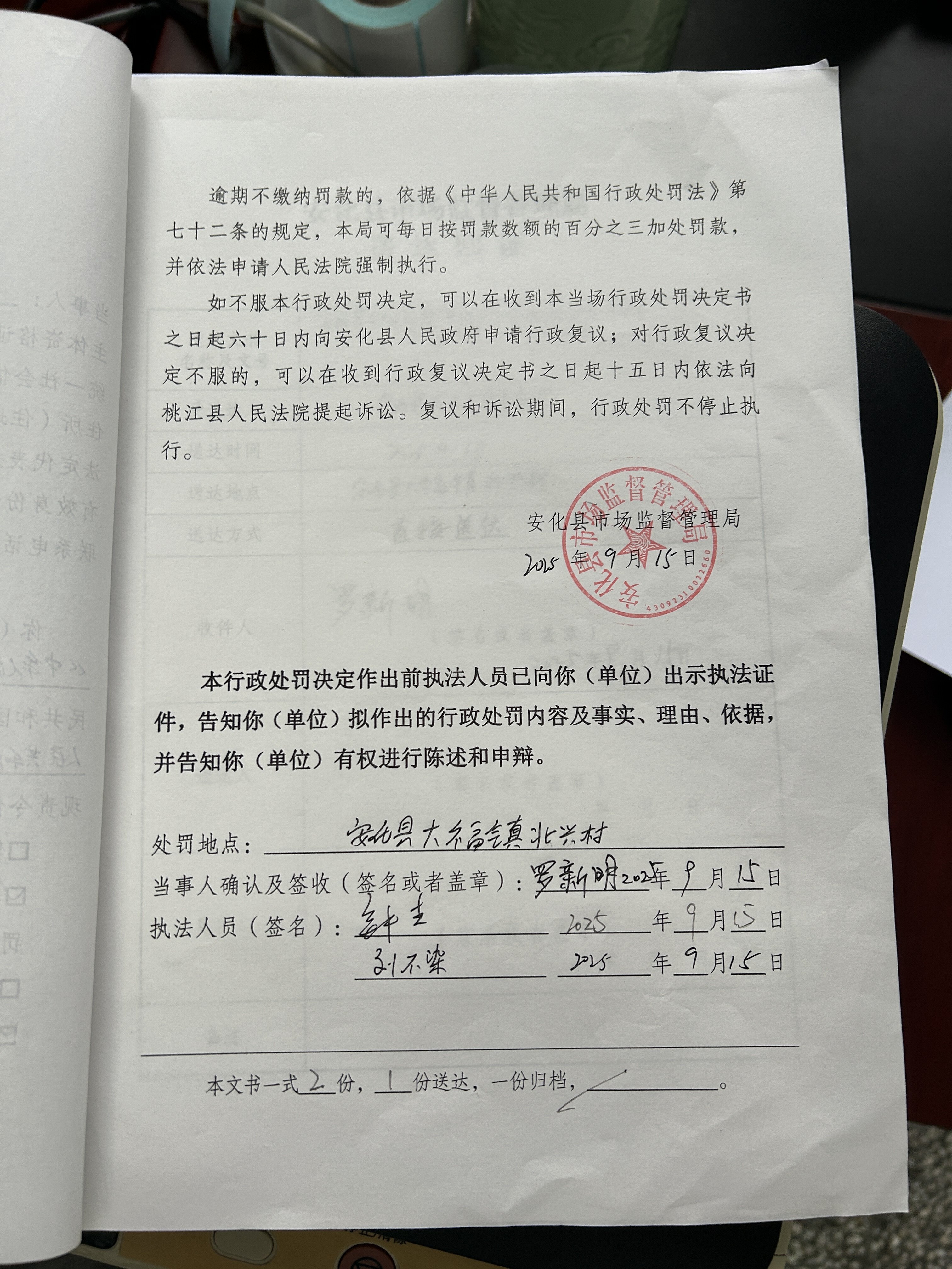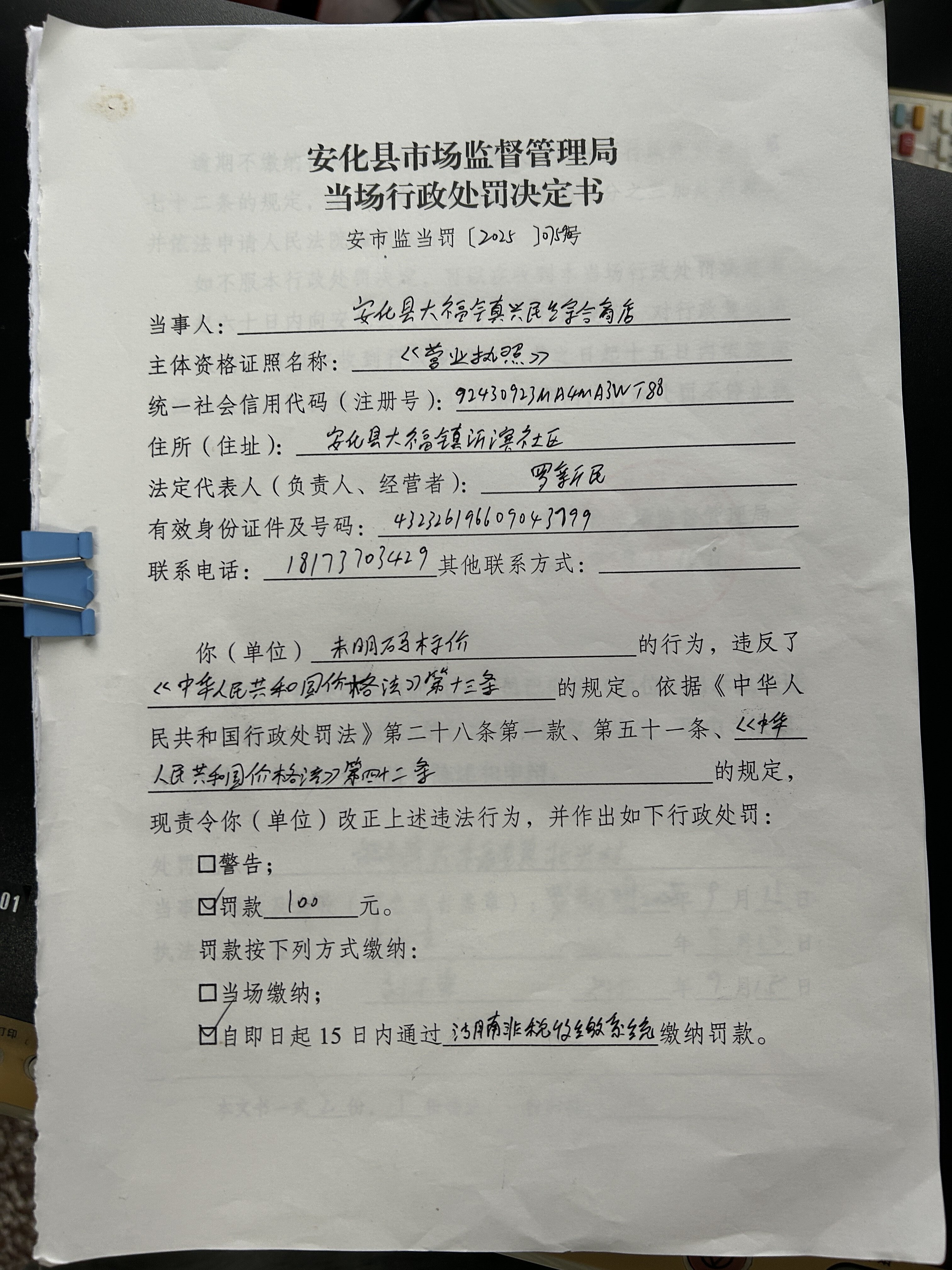 安化县市场监督管理局当场行政处罚决定书 安市监当罚 [2025] 07590号