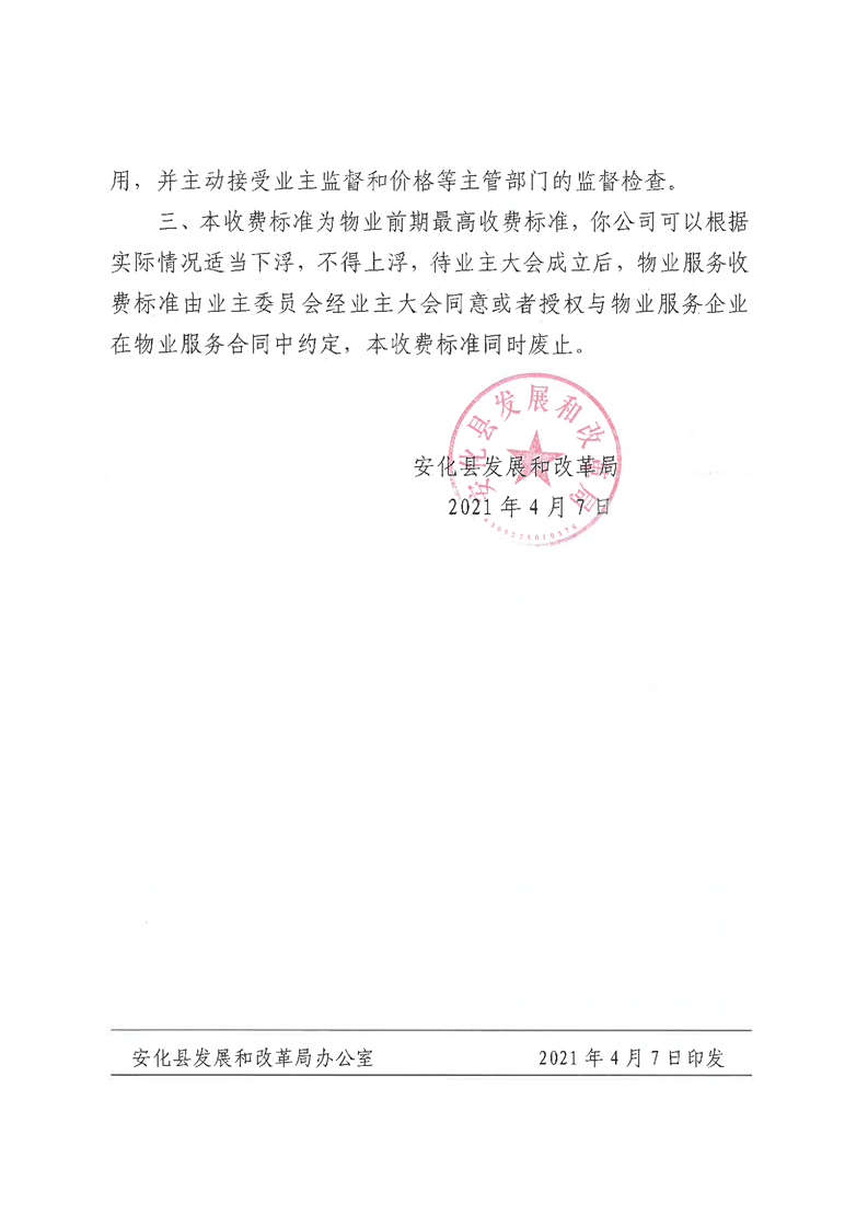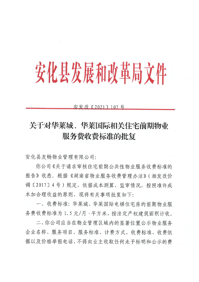关于对华莱城、华莱国际相关住宅前期物业服务费收费标准的批复