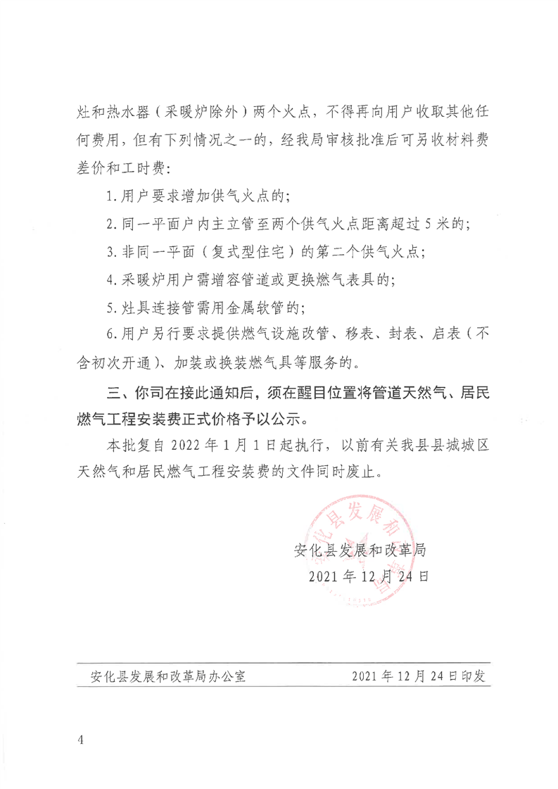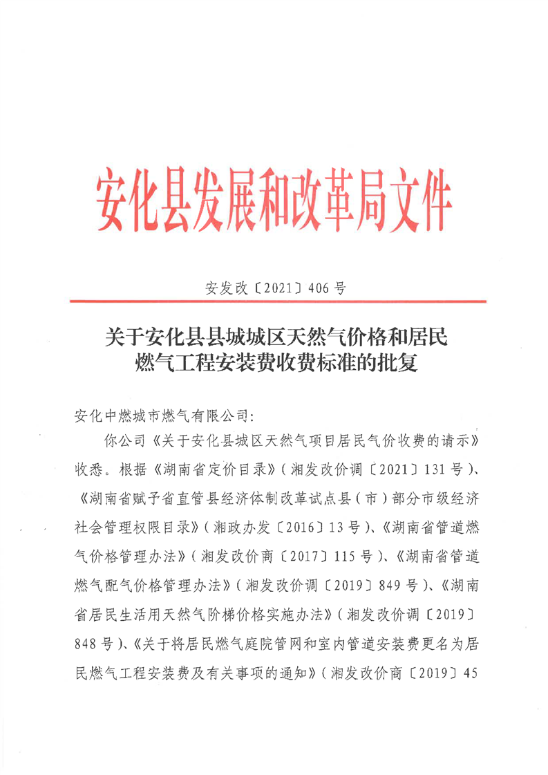 关于安化县县城城区天然气价格和居民燃气工程安装费收费标准的批复