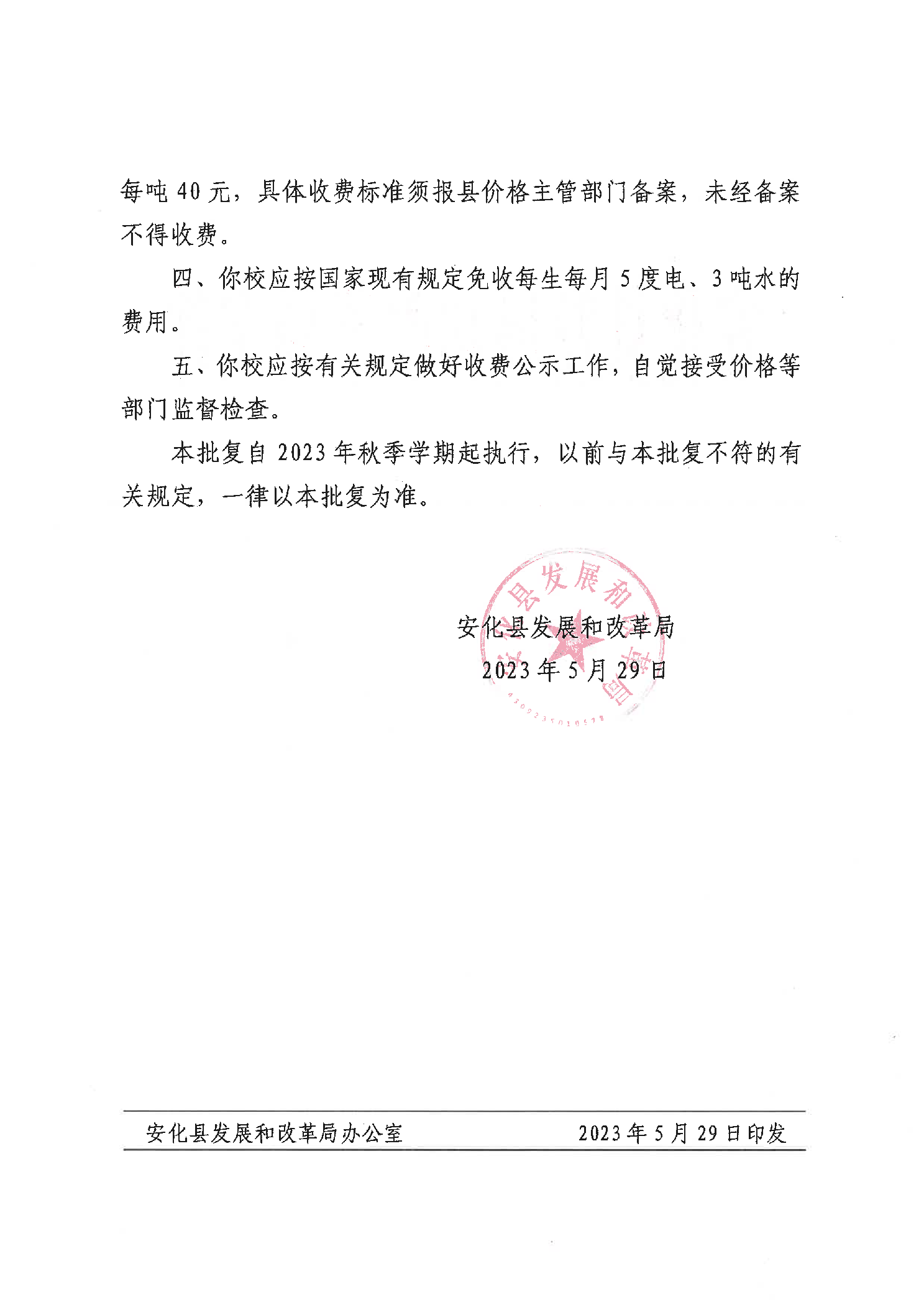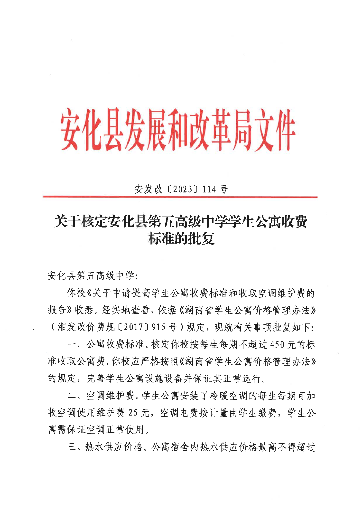 关于核定安化县第五高级中学学生公寓收费标准的批复