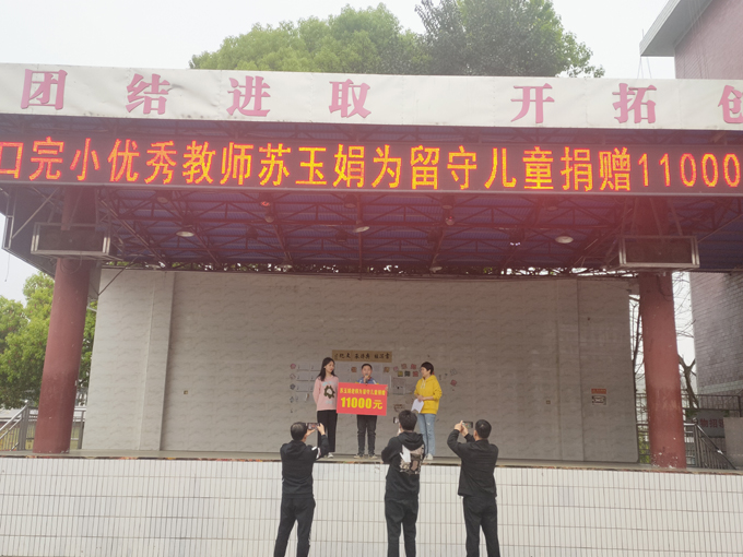 本网讯:“留守儿童更需要社会的关注,我做为一个班主任老师,对此很了解。我把这次获得的奖金捐给留守儿童,希望能在生活上、精神上、学习上给他们一点关怀和帮助。”3月30日上午课间操时段,安化县平口镇完小优秀教师苏玉娟为全校留守儿童捐款11000元时说,留守儿童苏航代表全体留守儿童接受了捐赠。 平口完小地处湖南省安化县平口镇,属山区,经济条件落后,老百姓主要靠外出务工挣钱供应家庭开支。因此该校有大量留守儿童,据统计2021年春季学期学校共有留守儿童545名,这些留守儿童平时很少享受到父母的关爱,他们的健康成长关乎家庭的幸福以及社会的稳定。苏玉娟是学校116班的优秀班主任老师,3月16日因工作尽责意外挽救了一个留守儿童一家三口的生命,而获得了三湘都市报联合阿里巴巴天天正能量颁发的“天天正能量”特别奖,平口镇党委、平口中心校、平口完小相继也给予了苏玉娟奖励现金共计11000元。今天,苏玉娟把10000元奖金全部捐赠给了学校,此笔款项专用于给该校的留守儿童购买学习用品,另1000元奖金看望慰问了受伤的学生。 该校全体师生参加了捐赠仪式,苏老师的善举获得了大家的一致赞赏。(通讯员 周乐斌)