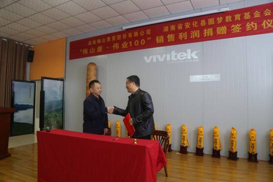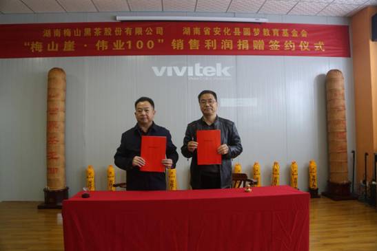 本网讯 4月13日上午,“梅山崖·伟业100”销售利润捐赠签约仪式在江南镇工业园区湖南梅山黑茶股份有限公司举行。 9点38分,湖南梅山黑茶股份有限公司董事长陈安社与湖南省安化县圆梦教育基金会理事长杨方华签订捐赠合作协议,该公司以捐赠资金的方式助力安化教育事业发展。 据了解,该公司每销售一套“梅山崖·伟业100”黑茶产品,捐赠20元给湖南省安化县圆梦教育基金会。捐款资金主要用于奖励优秀师生,资助特困师生及改善边远学校办学条件。 杨方华代表安化县圆梦教育基金会向湖南梅山黑茶股份有限公司的爱心和善举表示感谢,并承诺为每套“梅山崖·伟业100”黑茶产品提供印有公章的爱心卡。陈安社表示黑茶是安化的名片,公司不仅有社会责任,更有教育情怀,以后还会长期支持教育事业,为安化教育发展贡献力量。(通讯员 王枚生 刘丰跃 陶安琪)