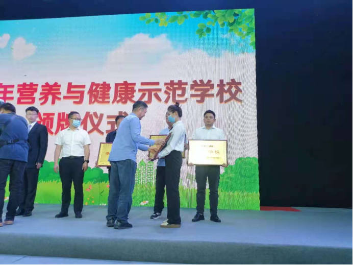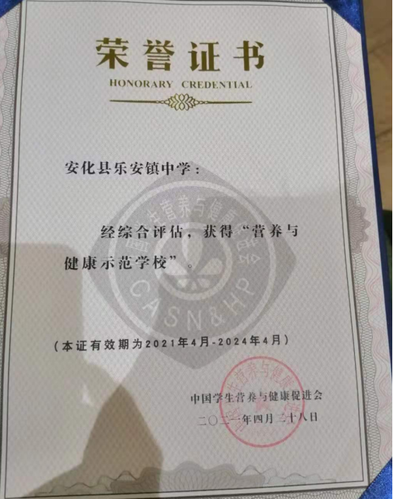 本网讯 5月18日上午,乐安镇中学全体师生兴奋不已,美丽的校园里弥漫着喜庆的空气,学校总务主任李汉斌从北京领回了全国“营养与健康示范学校”的奖牌,湖南省仅有4所。这是该校继省级“安全文明校园”和“全国青少年校园足球特色学校”以来又一次高级别的荣誉,全体师生在校长蒋吉贵一班人的带领下,通过多年的不懈努力共同取得的成果。 营养与健康是青少年全面发展的基础,不仅关系到千家万户的幸福,更关系着国家与民族的未来。近年来,学校在不断提升教学质量的同时,致力于改善学生的营养与健康状况,全面加强学校的食堂管理与体卫工作,制订了专门的营养与健康工作方案,学校秉承“关注每个学生的身心健康,为学生的终身发展奠基”的办学理念,以“成就非凡学业,建构诗意人生”为办学目标。坚持做到了营养与健康工作重点抓,经常抓,明确专人负责,协调各部门工作,落实各阶段任务。 学校定期组织食品安全与卫生健康知识培训,经常进行学生营养膳食咨询调查,广泛开展阳光体育活动,严格落实学生体质监测制度,及时发现问题进行整改。 4月13日,该校顺利通过了由省市县多级部门组织的专家组现场评估与验收,专家们经过详细查阅资料、现场察看、深入走访,对乐安镇中学的学生营养与健康工作给予了高度的评价。事后,学校的该项资料又接受了国家与省里的综合评定,最终湖南省共有4所学校上榜表扬,并参加在北京广播大厦举行的颁奖仪式。 “珍惜盘中餐,粒粒助健康”,这是2021年“5.20”中国学生营养日主题,乐安镇中学的学生营养与健康工作,步子迈得早,走得稳,堪称全国广大学校的楷模与典范。