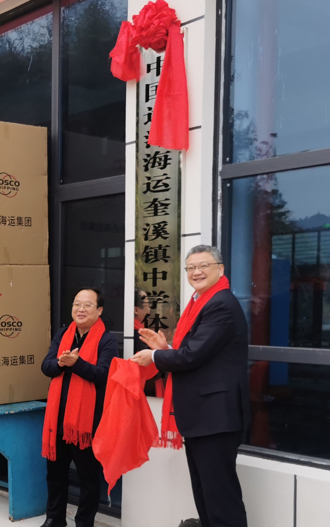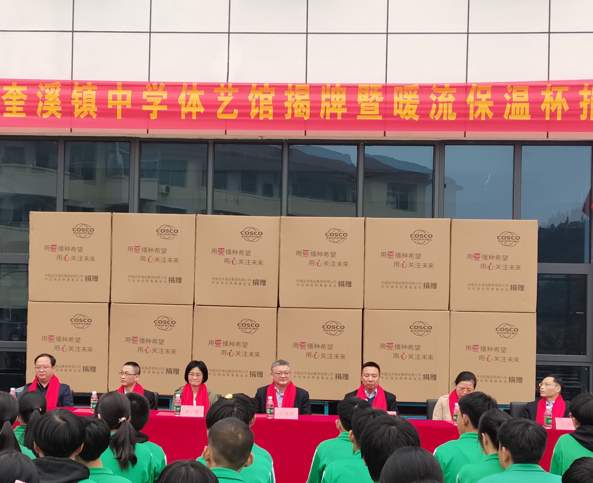 揭牌和捐赠仪式在新落成的中远海运奎溪镇中学体艺馆前坪进行,由奎溪镇中心校校长唐汝党主持此次捐赠仪式,奎溪镇党组副书记、镇长邓尔平致欢迎词,奎溪镇中学校长周飞霄代表全校五百多名师生致感谢词。王海民与莫超共同为中远海运奎溪镇中学体艺馆揭牌,并当场为该校学生捐赠暖流保温杯。揭牌和捐赠仪式结束后,王海民等一行参观了新落成的体艺馆和校园。王海民指出,作为有担当、有大爱的国家企业,中远海运有责任、有义务为边远山区、革命老区等提供力所能及的帮助和支持,给山区的师生送去温暖和关爱,希望山区的孩子学有所成,将来更好的为祖国、为家乡做出贡献。