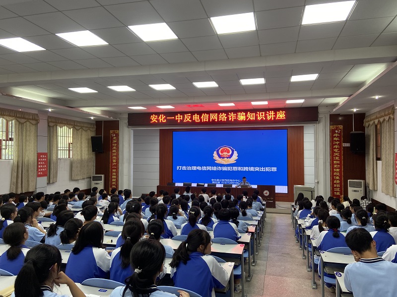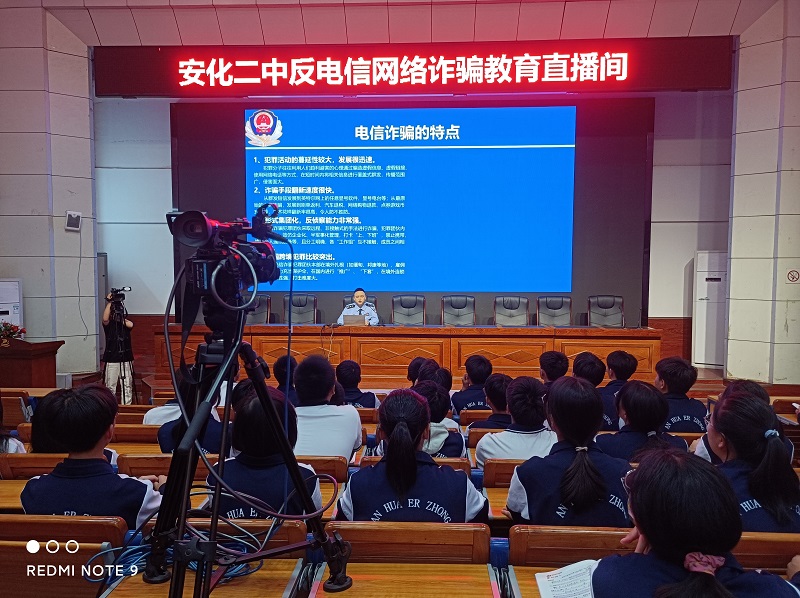 (安化二中电信网络诈骗专题讲座200多余师生现场聆听,50多个班级同步直播)