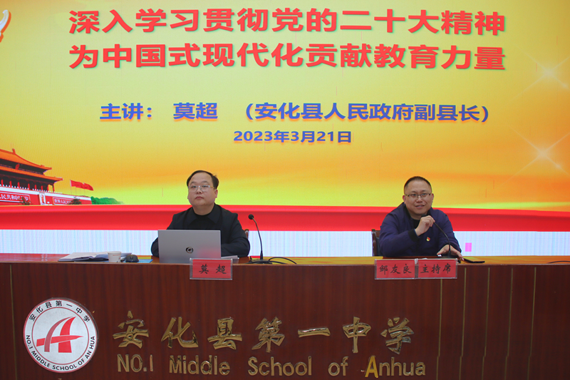 本网讯 3月21日,安化县人民政府党组成员、副县长莫超深入安化一中为全体教职员工宣讲党的二十大精神。宣讲会由县教育局党组副书记、副局长邹友良主持。 莫超以党的二十大报告原文为基础,结合我县教育实际与目前教育新形势,围绕全面学习把握落实党的二十大精神的重大意义,阐释了“为什么要学”的问题;在梳理党的二十大精神内涵的基础上,明确了“学什么”的问题;从落实党的二十大精神的实践意义与当代教师的使命担当出发,指明了应该“怎么干”。 莫超指出,党的二十大对新时代新征程全面建设社会主义现代化国家、全面推进中华民族伟大复兴的一系列重大决策做出整体部署,具有特殊历史地位和深远历史意义。党的二十大报告首次把教育、科技、人才进行统筹安排、一体部署,单独列章阐述,极具战略意义和深远影响。 莫超要求,新时代的一中人,要做执行者、行动派、实干家,要依照习近平总书记的要求和党的二十大报告对教育和教师的要求,做有理想信念、有道德情操、有扎实学识、有仁爱之心的“四有”好教师。要把为学、为事、为人统一起来,为青年学子系好人生的第一粒扣子。 莫超强调,安化一中要深刻领会党的二十大精神的丰富内涵,在所取得成绩的基础上,将学习贯彻党的二十大精神与推动学校教育高质量发展有机融合,努力办好人民满意的高中教育。