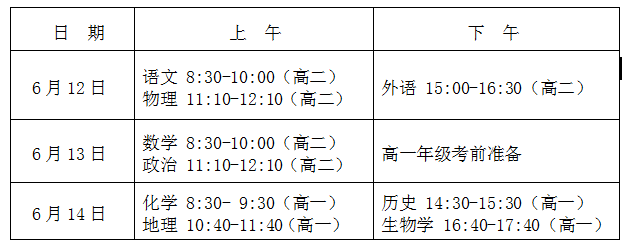 今年学考,全县8230人报名,高二组合3922人,高一组合4294人,其他组合14人。共设安化一中、安化二中、县职业中专三个考点。其中安化一中、安化四中、安化五雅高中考生在安化一中考点参考;安化二中、安化三中、县江英高中考生在安化二中考点参考;安化五中、安化十二中考生在县职业中专考点参考。 考试具体时间为: