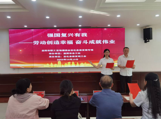 本网讯 近日,安化县教育局举行了以“强国复兴有我 劳动创造幸福 奋斗成就为业”为主题的职工朗诵活动。干职工以良好的精神面貌,立足立德树人主业,讴歌新时代劳动者,礼赞劳动美。 本次诵读活动是根据市总工会的工作安排而进行的。共有二十个朗诵节目参加比赛,节目分集体和个人两种形式。有原创诗歌朗诵《依然在路上》《我骄傲,我生长在中国黑茶之乡》;有不忘教育初心,牢记育人使命,满怀信心跟党走的《亲爱的党啊,请听我说》;有充满责任与担当的《强国复兴有我,做最美教育人》;有生活不止眼前的苟且,还有《诗与远方》;有“此生无悔入华夏,来世还生种花家”的《歌颂心中的祖国》;有美好生活,劳动创造的《劳动创造美好,奋斗收获幸福》;有三尺讲台,筑就教育强国之梦,培桃育李,共谱新时代劳动赞歌的《中国梦,劳动美》等。比赛最后评选出一等奖4个,二等奖4个,优秀组织奖2个。 县教育工会负责人及县总工会相关干部出席诵读活动。