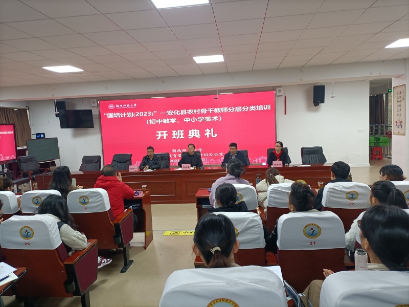 本网讯 11月15日上午,“国培计划(2023)” 安化县农村骨干教师分层分类培训(中小学美术)活动在萸江学校举行。 开班仪式由湖南省教育管理干部培训办公室、湖南师范大学中小学校长和教师培训部教学科长陈甲元主持。萸江学校常务副校长胡秀女致欢迎词,安化县教师发展中心主任李拥军作中心发言,他表示,所有学员要有为党育人、为国育才的正确思想,要珍惜此次难得的学习提升机会,扎实学习,学习期间要遵纪守法,树立良好的教师形象。 据悉,本次培训活动由安化县教师发展中心举办,萸江学校承办,历时6天,全县各中小学校美术骨干教师参加。活动采用专家讲座、名师送课、课例磨研的方式进行。湖南师范大学屈卫国、陈牛则、肖弋等专家将分别进行专题讲座;长沙市岳麓区博才中海小学张询老师将送来小学美术示范课《好玩的剪纸花纹》,长沙市铁路第一中学刘晓枫送来初中美术示范课《美术的起源——原始人的创造》;此外,萸江学校李盼、安化县第一芙蓉学校陈晨两位老师将开展两堂美术教学课并进行现场研课。