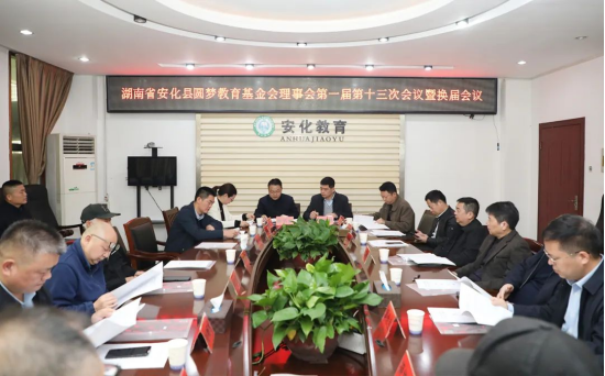 -top: 0px; margin-bottom: 0px; text-align: justify; line-height: 2.2;"> 全体参会人员合影 本网讯 4月2日,湖南省安化县圆梦教育基金会理事会第一届第十三次会议暨换届大会在安化县教育局圆满召开。益阳市教育基金会副理事长何湘旺、市教育基金会副理事长兼秘书长刘文凯;安化县人民政府党组成员、副县长莫超,安化县政协副主席、县工商联主席刘畅术,安化县教育局党组书记、局长陈羽成,安化县民政局党组成员、副局长刘红兵,安化县教育局党组成员、副局长刘周明等领导出席会议。