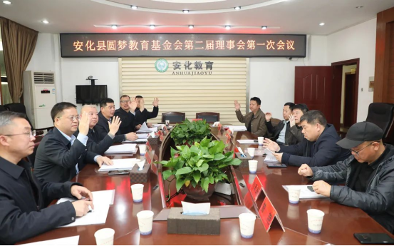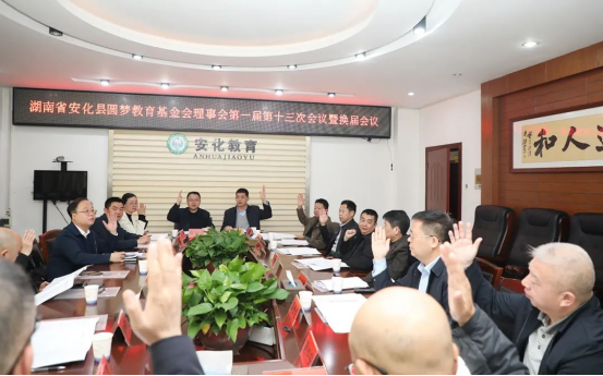 与会人员举手表决 本次会议由安化县教育局党组书记、局长陈羽成主持。会议全面总结了第一届理事会工作成果;审议了《安化县圆梦教育基金会第一届理事会工作报告》《安化县圆梦教育基金会第一届理事会财务工作及审计情况报告》《安化县圆梦教育基金会第一届监事报告》;宣布了《湖南省民政厅关于确认湖南省电力工程企业协会等66家社会组织评估等级的决定》,安化县圆梦基金会获评“5A级社会组织”。安化县教育局党组成员、副局长刘周明作《关于安化县圆梦教育基金会第二届理事会组成人员建议名单、监事选派名单的说明》,与会人员举手表决。 湖南省第十四届人大代表、安化县第二高级中学原校长刘仁先;迪姆锦源(湖南)科技有限公司董事长、长沙市安化商会党支部书记、执行会吴余生;深圳市乐康实业投资有限公司董事长、益阳市政协委员、益阳市政协深圳委员工作室总召集人、深圳市安化商会会长、安化县经促会深港分会理事长李德新,安化县圆梦教育基金会原副理事长兼秘书长杨芳松;北京航翔广告有限公司总经理、湖南安化百花寨茶旅文化有限公司总经理姚社初;绿之韵生物工程集团有限公司常务副总裁胡均安;北京诚生顺达商贸有限公司法人代表、董事长、北京安化二中校友会会长谌义忠;广东欧赛莱科技有限公司董事长、广州市湖南安化商会名誉会长、安化经促会广东分会名誉理事长蒋永忠;广东知恩律师事务所合伙人、广州市湖南安化商会会长、安化经促会广东分会理事长、广东广信君达律师事务所律师合伙人蒋建凡共9人当选为理事。选派安化县民政局慈善事务中心主任简政、安化县圆梦教育基金会原副理事长、安化县教育局机关工会主席曾艳为监事成员。 安化县政协副主席、县工商联主席刘畅术就如何做好教育基金会的相关工作提出了三点要求,要积极发挥好安化商会和异地安化商会的平台作用;安化县圆梦教育基金会取得的成果不易,要确保把资金落到实处;要在全县教育系统均衡划分“圆梦基金”的使用。 随后,安化县人民政府党组成员、副县长莫超讲话。他首先代表安化县人民政府向安化县圆梦教育基金会的同志们致以亲切地问候,对为安化县教育基金事业付出辛勤劳动、作出卓越贡献的各位社会贤达、爱心人士表示崇高的敬意和衷心的感谢,向刚刚当选的安化县圆梦教育基金会新一届理事表示热烈祝贺。第一届理事会殚精竭虑募集资金,坚持公益方向,紧扣教育需求,不断拓展教育奖励和救助范围,为教育强县建设作出了突出贡献,也取得了丰硕的发展成果,充分体现了教育基金会促教育事业发展、为师生解忧的拳拳爱心和社会担当。教育基金会是全县教育事业的重要组成部分。借此机会,他提出三点意见:一是肯定教育基金会为促进安化教育事业发展取得的良好成效;二是希望教育基金会为促进安化教育事业高质量发展再立新功;三是恳请社会各界继续大力支持教育基金会工作。 换届会议结束后,安化县圆梦教育基金会召开了第二届理事会第一次会议。选举了理事长、副理事长兼秘书长;安排了基金会各部门工作人员;讨论通过了《2025年工作计划》、《基金会五年规划(2025-2029)》、《章程》的修改。